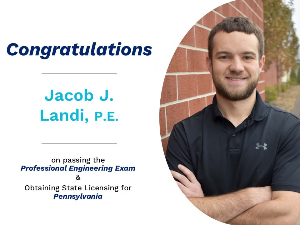 Please join us in congratulating Jacob J. Landi, P.E. on passing the Professional Engineering exam and becoming a Licensed Electrical Professional Engineer (PE) in Pennsylvania!
